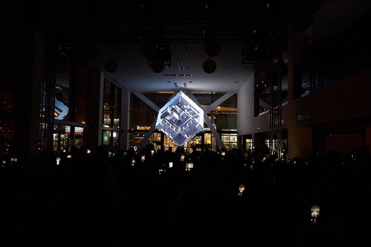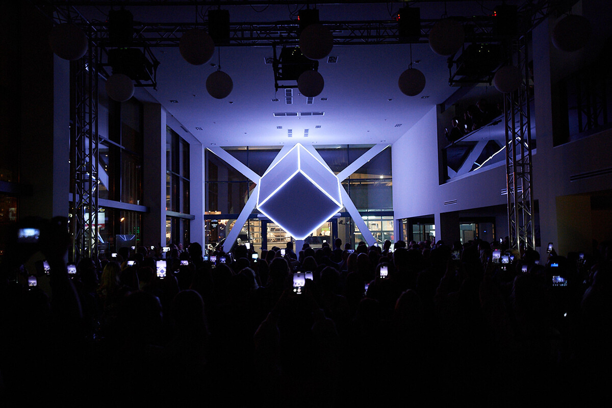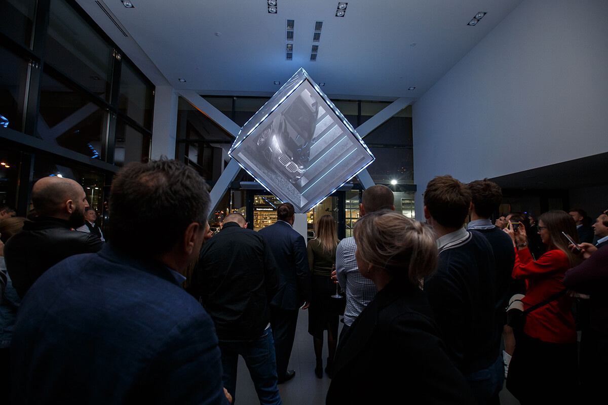 Кульминацией мероприятия стало захватывающее 3d mapping шоу на трехгранном кубе, сопровождающееся уникальной графической и мультимедийной анимацией и звуковым манифестом от официального голоса BMW в России Андреем Ивановым.