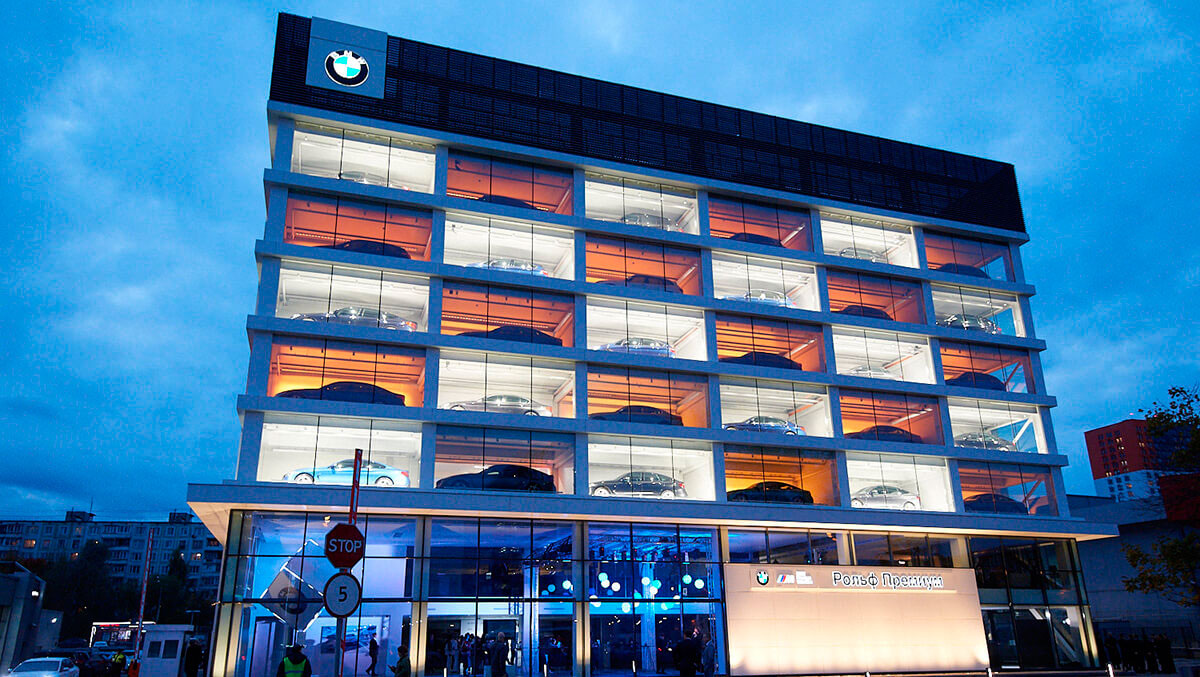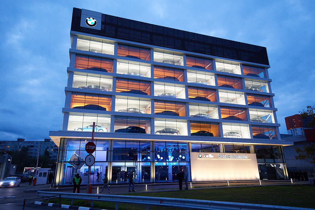BMW РОЛЬФ-Премиум Химки – единственный дилерский центр BMW в России, выполненный по абсолютно новым премиальным архитектурным стандартам. А уникальной узнаваемой особенностью дилерского центра является фасад в виде витрины из 30 автомобилей BMW в отдельных ячейках, которые подсвечиваются в темное время суток.